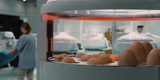You can catch an ever-so-quick shot of various eggs, embryos and beakers of various organisms being process tested. And what are two of them labelled?