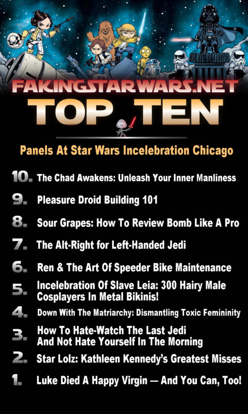 Not only will Incelebration host the debut of the trailer for the fan remake of The Last Jedi, it will also feature a series of unforgettable panel discussions. FSW pulled some strings and managed to get a list of the Top 10 Panels At Star Wars Incelebration Chicago.